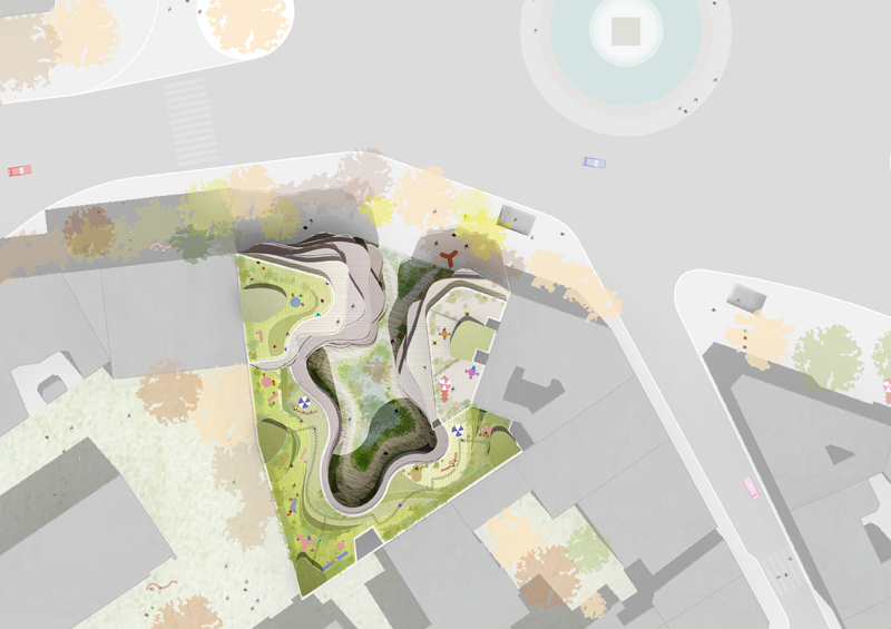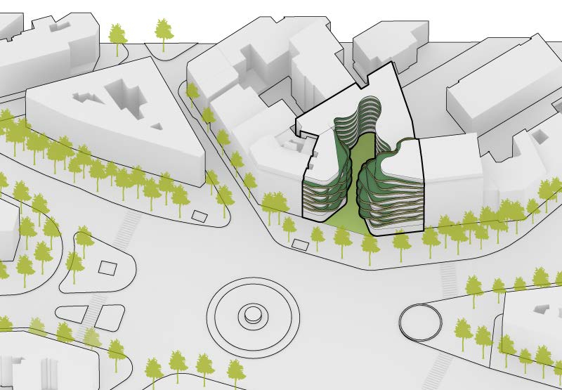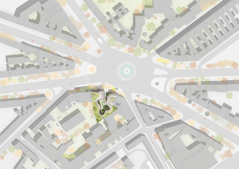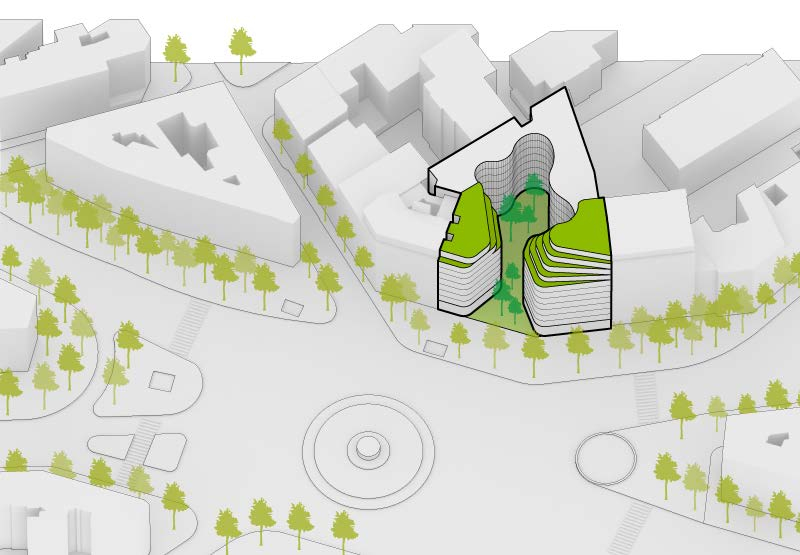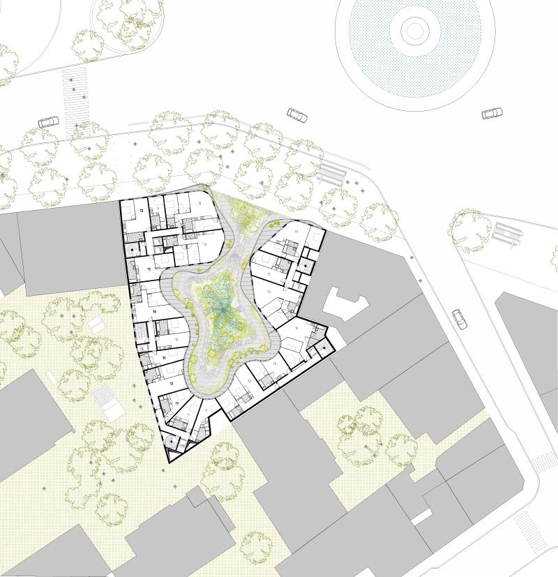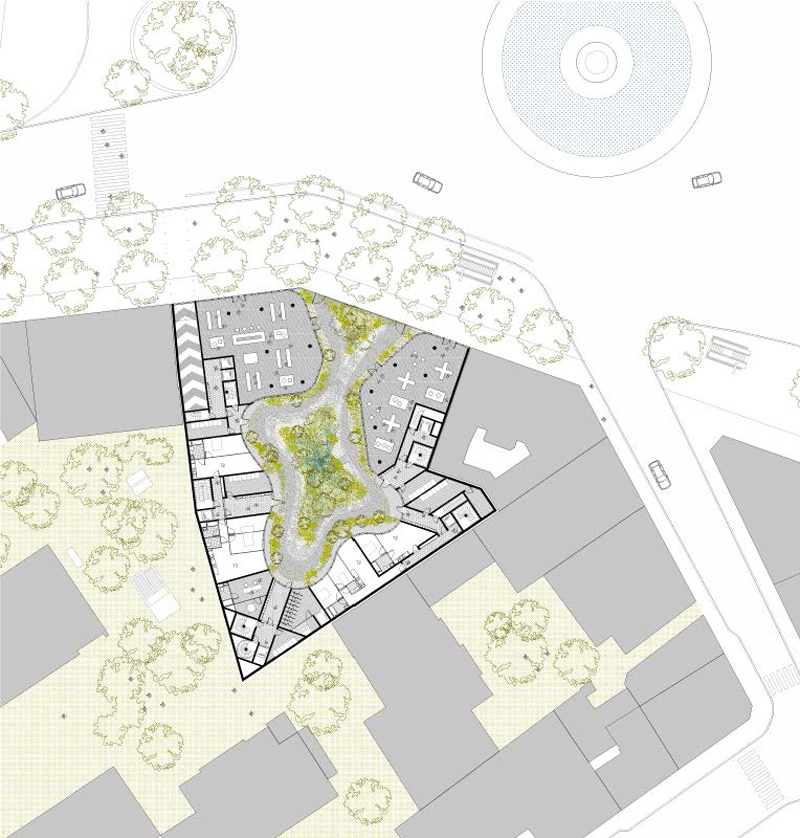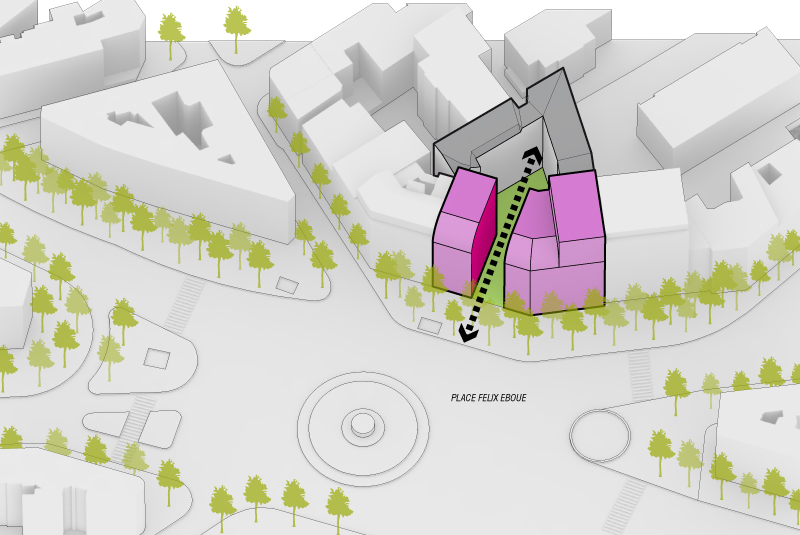 La faille est ici, non seulement dénominateur commun public/privé, mais aussi bien collectif via lequel l’ensemble des résidents et leurs hôtes transiteront. Un même accès pour les logements sociaux et les logements en accession, un même accès à tous les services : jardin, local vélos, halls, caves, locaux poubelles, jardins en toiture… C’est ici la figure du porche ouvert, porche paysagé qui nous intéresse. Le jardin s’arrête en limite de parcelle, derrière une clôture de verre scindant un socle bâti qui s’évase légèrement. En bordure de la place, de part et d’autre du jardin, deux commerces constituent le socle, le rapport au sol avec des vitrines de verre de 6 mètres de haut. A l’extrémité ouest se trouve l’entrée d’un petit parking qui reprend les sous-sols existants suivant la même démarche de durabilité, dans une économie constructive de temps et d’argent pour un chantier plus propre avec moins de poussière, moins de désagrément pour le voisinage, moins de risques pour les avoisinants.