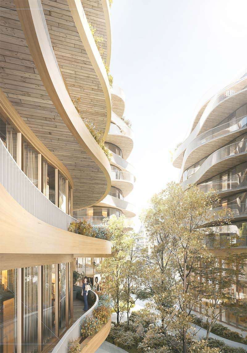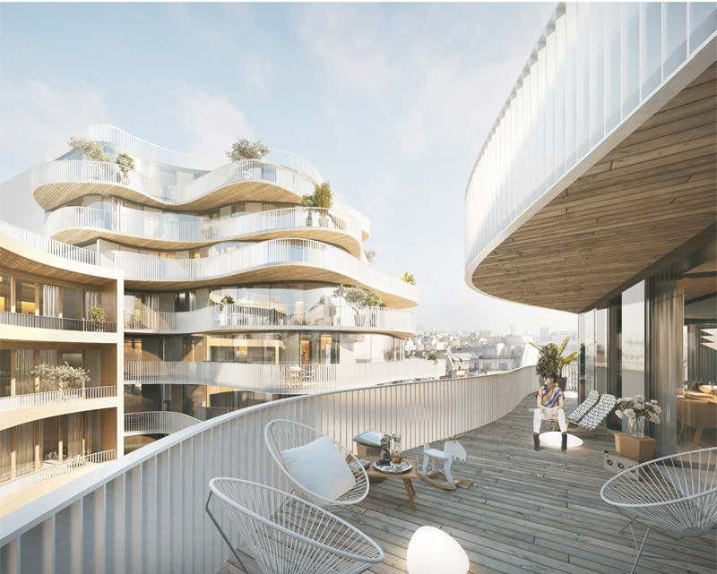 Les volumes sur rue sont sculptés pour venir habiller les pignons qui se trouvent de part et d’autre de notre parcelle. Ces volumétries sont clairement envisagées comme des pièces d’articulation, comme des pivots qui retournent le front bâti vers une intériorité. La fluidité est recherchée, figure d’un Paris plus organique où la masse n’est pas affirmée de façon frontale mais sculptée pour venir enlacer le paysage. Dans une recherche d’entrelacement des pleins et des vides, l’ensemble des lignes de niveau est prolongé par un jeu de balcons tous spécifiques, ondulant à chaque niveau. Ces vastes balcons en prolongement de l’ensemble des logements constituent autant de valeurs d’usages : vivre dans son environnement, inventer ce que l’on veut y vivre. La façade est en relief avec une forte présence des sous-faces, toutes revêtues de bois. Des garde-corps constitués de plats métalliques assurent une relative transparence depuis les logements tout en garantissant une vraie intimité et un moirage chatoyant au regard des piétons et des flux des voitures. Les limites des logements sont constituées de baies en menuiseries de bois naturel de 1 mètre de large et de panneaux pleins de mêmes dimensions en verre émaillé. Ce jeu avec un même matériau, assurant pleins et vides, transparences et opacité dans une même texture, avec les mêmes reflets, génèrent des ondulations chatoyantes.