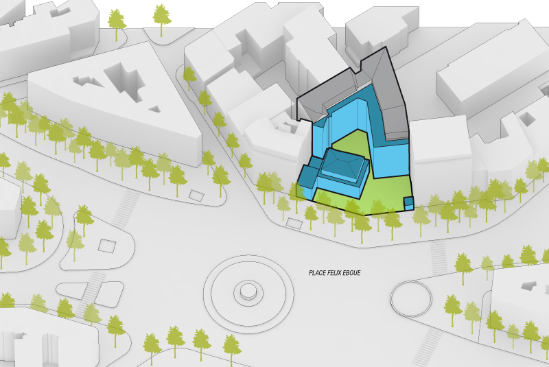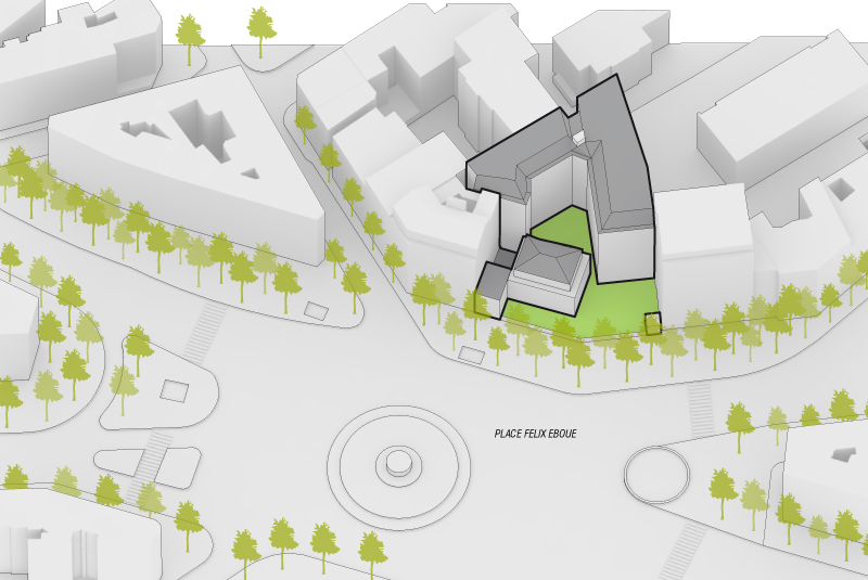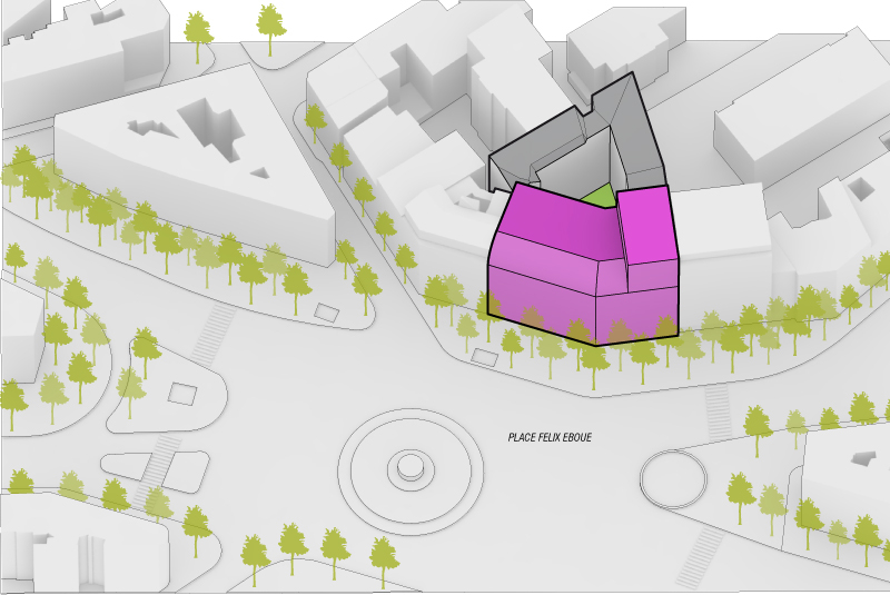 De l’audit de l’existant, notre premier constat est la simplicité et l’efficacité de la gestion des limites de la parcelle avec les mitoyens, au moyen de volumes construits de bonnes factures, de généreuses hauteurs avec de belles prises de jour sur les tréfonds voisins. Il s’agit là d’un capital que l’histoire nous transmet et que nous ne serions plus en mesure de produire, dont la destruction serait sans retour. Nous héritons d’un écrin magnifique en limite mitoyenne alors que le rapport à la place, à l’espace public est chaotique, peu qualitatif, obsolète.