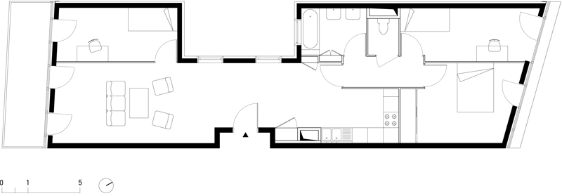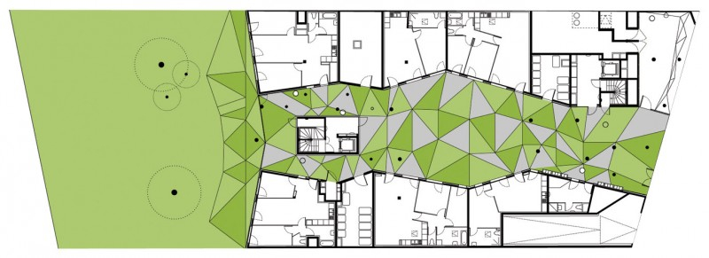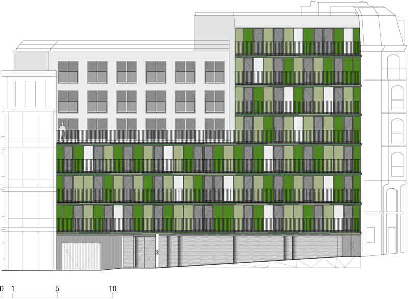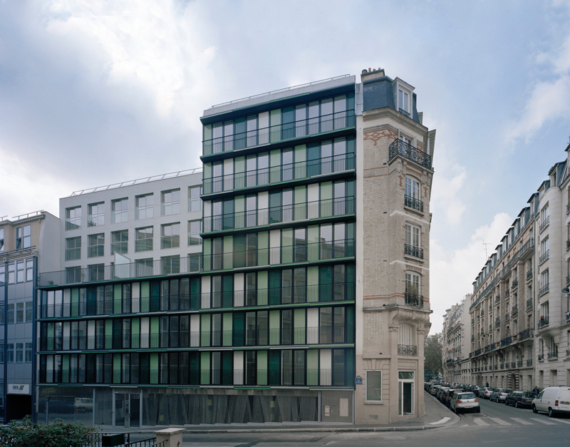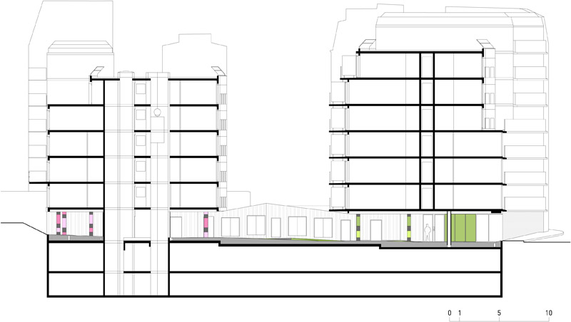 Located at the intersection of the homogeneous and haussmannian landscape along Gossec Street, and of the disparate architecture made up through time on Picpus Street, the site on which this 63 social housing program is established is an element of a typical “collage-city” landscape, also characterized by a double movement of the natural soil: the connection, on its front part, to the deep slope of the Picpus Street, and, on its backyard limit, to a landmark garden, 1.50 m higher than the average level of the soil. The project is a proposition to link these opposite typologies and soil movements. Two parallelipedic buildings, respectively 7 and 6 levels high aligned in parallel on the front and back limit (north and south) of the plot are set up on stilts above two long ribbons which concentrate all the accommodations of the residence on the street side and keep clear a wide open space way far unto the landmark garden. In the courtyard, the rooftops of the ribbons, “vegetalized”, expand to propose « house-typed » apartments with high ceilings, equipped for the handicapped.