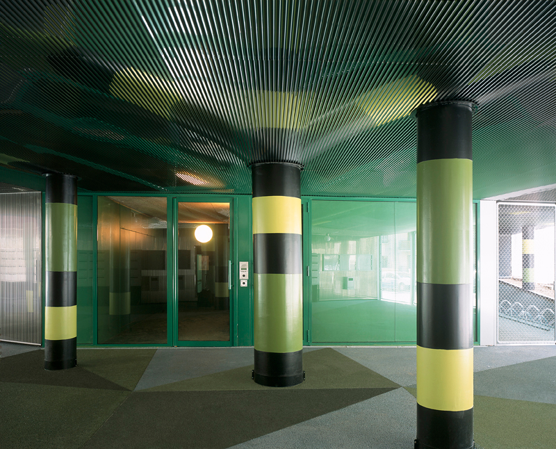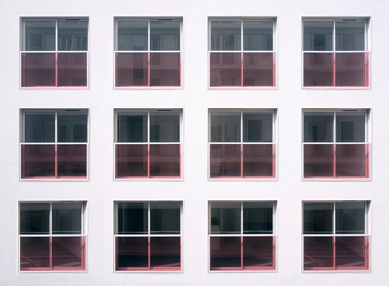 Each apartment or accommodation has its specific altimetry, in the exact prolongation of the kaleidoscope, generating a free movement of the doors and windows, emphasized by their reflection in the stainless cladding of the ribbons and the ceilings. One enters the residence through a metallic curtain by a wide porch in the axis of the project, and then each building has its own entrance hall. The project presents 2 colors, 4 specific facades conceived to respond to very specific solicitations, all characterized by wide windows, opened on large terraces or balconies (depending on their orientation), protected by colored glass treated like sunglasses.