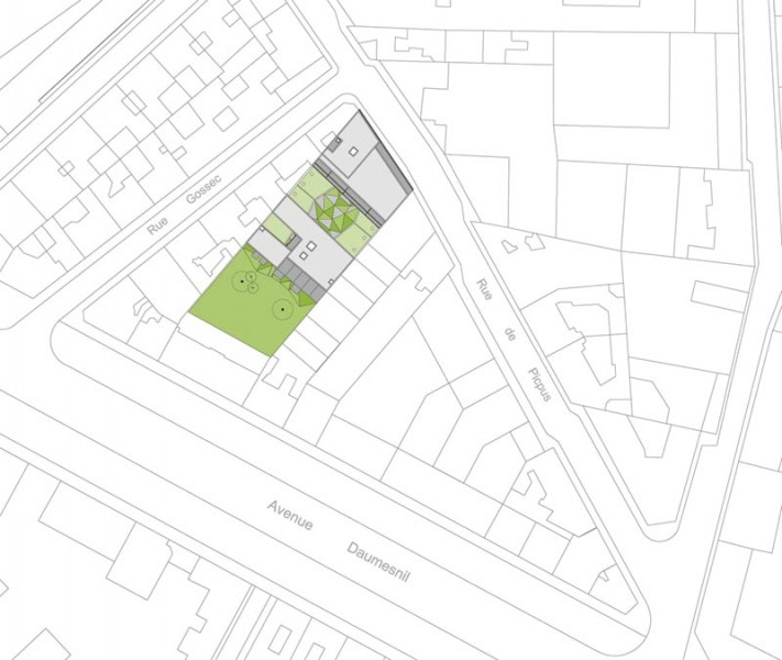 On Picpus street, West side, the project is connected to the truncated bow of the haussmannian building at the angle of Gossec Street, as if the site was a corner lot. It prolongs the fixture and the components of the architecture of the Gossec Street, proposing a sharp collage. East side, the project is aligned with the roof of the smooth facade of a building from the 70’s, also continuing the fixture and the components of the adjacent building, marked by a withdrawal that completes the project. Elevated on 2 parking levels, the ground floor slab appears like a mineral kaleidoscope, appropriate to dissolve the handicapped requirements in an opportunistic and playful mid-mineral mid-vegetal landscape.