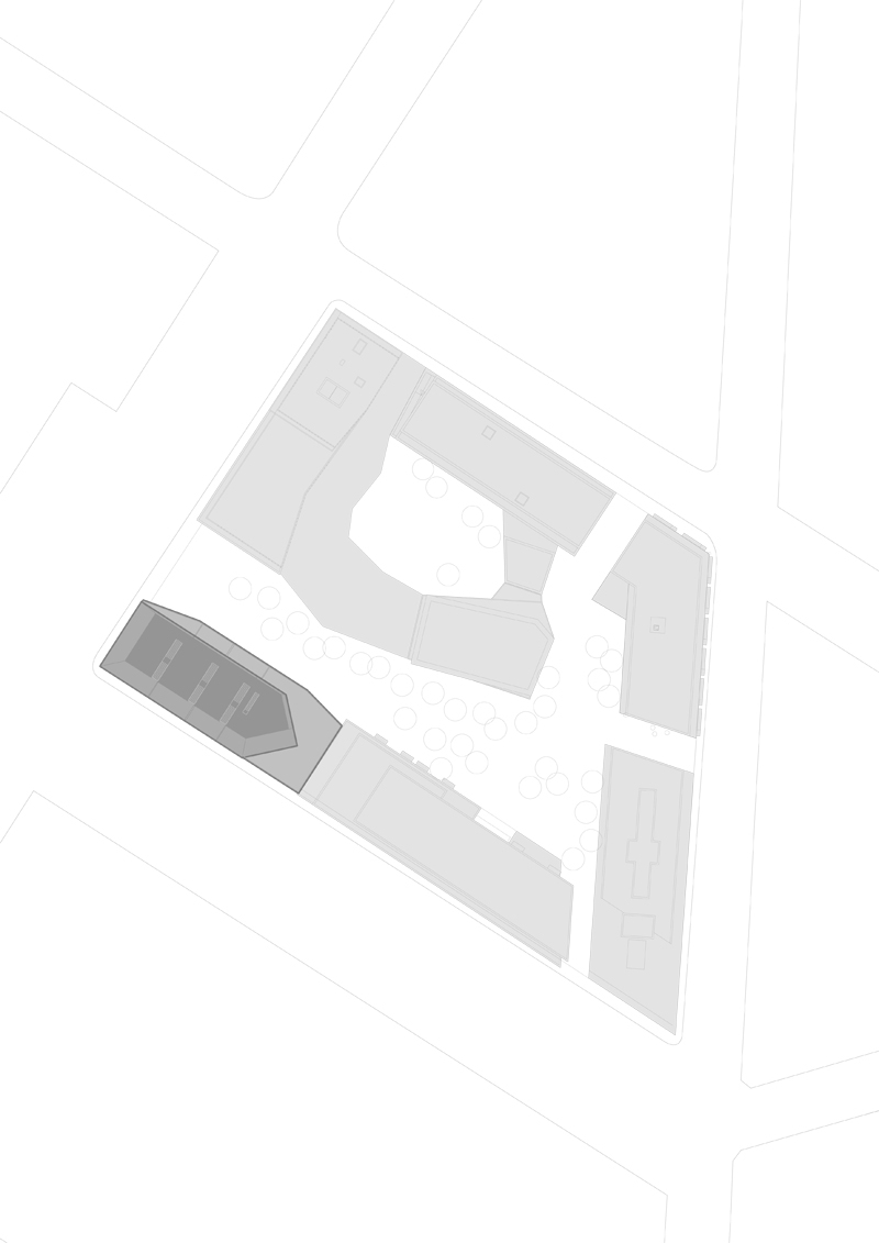 La programmation du projet est simple. Au rez-de-chaussée, un espace commercial fait face au parc du trapèze et occupe l’angle Sud-Ouest pour une bonne visibilité et une animation du pied de bâtiment. Les logements quant-à-eux sont accessibles par le cœur d’ilot par des chemins et des espaces végétalisés. Deux halls donnent accès aux 78 logements en accession du projet. La rampe d’accès au parking – commune aux lots B5A, B5D et B5E – se situe au rez-de-chaussée, dans la faille entre le bâtiment B5E et B5F. Elle se dissimule à l’est, laissant un large passage vers l’intérieur du macro lot. Habillée par une maille en métal tissé, elle est isolée de l’accès piéton tout en préservant une faille ouverte sur tout la largeur.