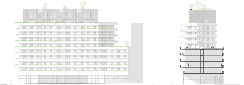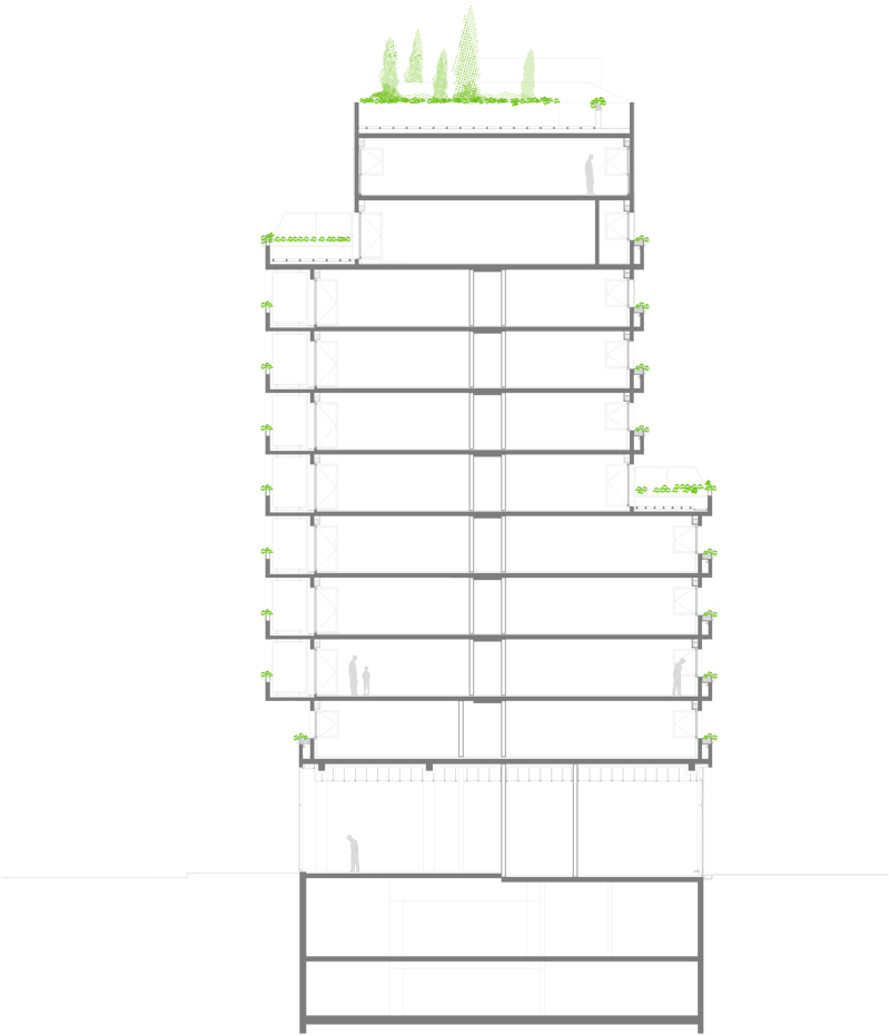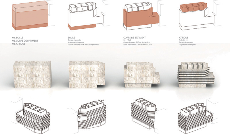 Dans le respect des réglementations applicables et des prescriptions architecturales du macro-lot, le bâtiment se compose en strates offrant différentes typologies, des vues et des cadrages variés, ainsi que des porosités sur le cœur d’ilot. Au rez-de-chaussée, sous une hauteur généreuse, une première strate largement vitrée comporte des espaces commerciaux, l’entrée des logements, et une faille vers le cœur de l’ilot comprenant l’accès à la rampe de parking.