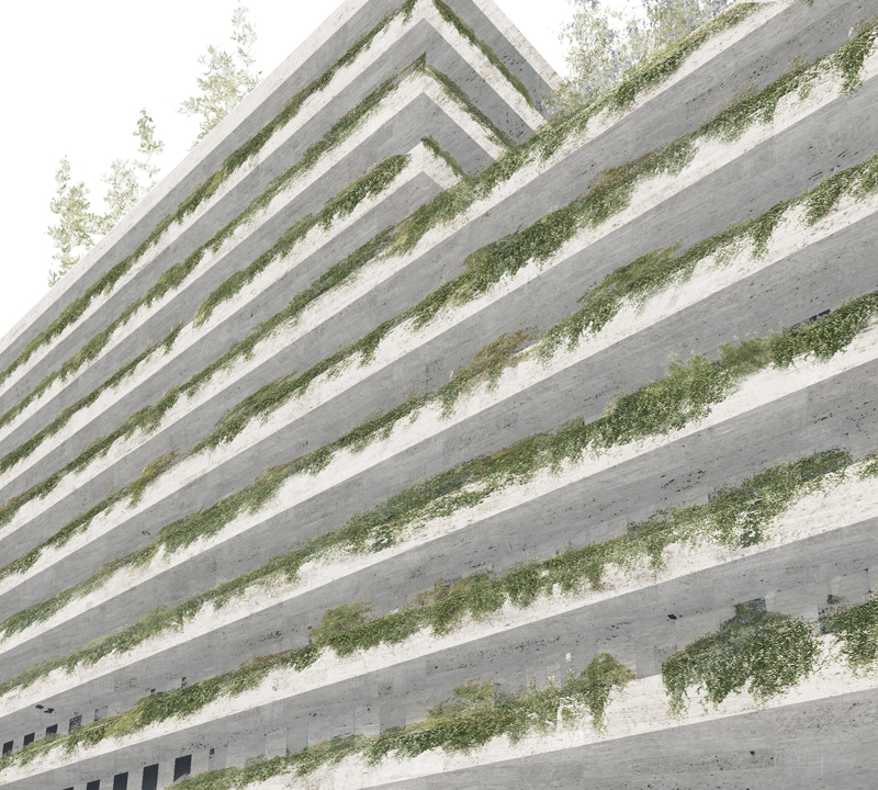 En lisière du parc le bâtiment met en relief végétale et minérale par l’affirmation d’une forme simple, faite à partir d’un matériau comme extraite d’un bloc de pierre. La matérialité du projet est affirmée par la sobriété volumétrique et le choix de l’utilisation d’une palette de matériaux extrêmement restreinte. Il y a donc une masse sculptée, compacte, massive en lévitation, suspendu au dessus du rideau de verre des commerces du RDC. Le socle, cette relation directe à l’espace public et au passant est transparent et léger, animé par l’activité commerciale. Le corps du bâtiment et strié par de longues bandes de balcons linéaires qui se déploie sur tout la longueur de la façade sud face au parc pour se retourner à l’angle ouest. Il s’agit de balcon panoramique, ensoleillé, ouvert sur le parc, la vallée de la seine, et les collines de Meudon.