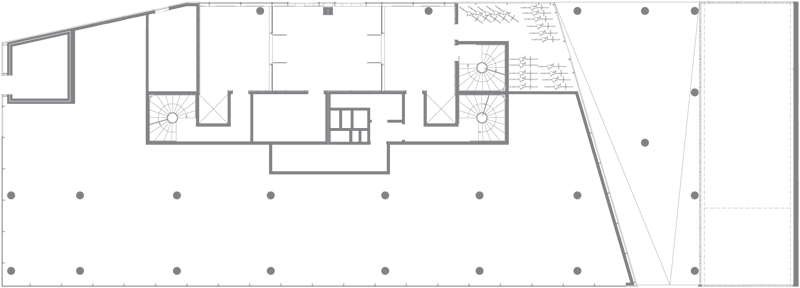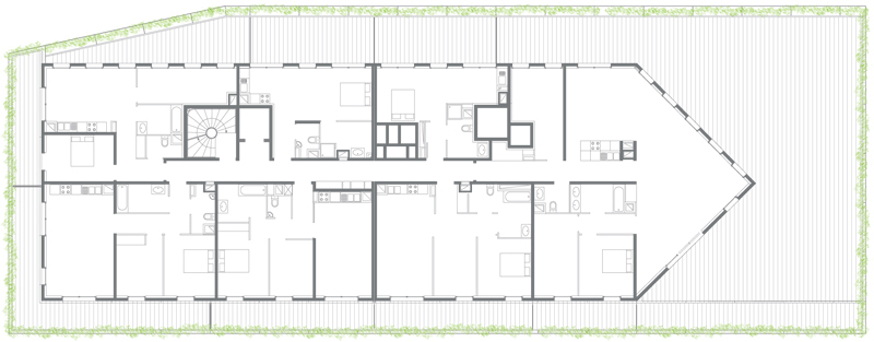 Du premier au quatrième étage, une autre strate contient les premiers niveaux de logements, et établit un contact avec le bâtiment mitoyen B5F. Du cinquième au huitième niveau, la volumétrie se compacifie, pour laisser place à une faille entre le bâtiment B5E et B5F, offrant de la lumière et des vues sur l’intérieur de l’ilot. Un traitement en murs biais permet d’offrir des vues dégagées et d’éviter les pignons aveugles dans cette faille. Dans les deux derniers niveaux, l’attique se positionne en retrait du reste du volume et marque le couronnement par une volumétrie sobre et contenue.