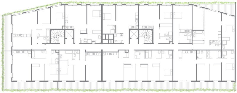 Au Nord et à l’Est, les balcons sont plus restreints, afin de faire pénétrer davantage de lumière dans les logements. Leur taille plus réduite est adaptée à l’ambiance du cœur d’ilot, plus intime, et également aux prescriptions architecturales du macro-lot. Des jardinières filantes sont mises en place et contribuent à la vie du bâtiment.
