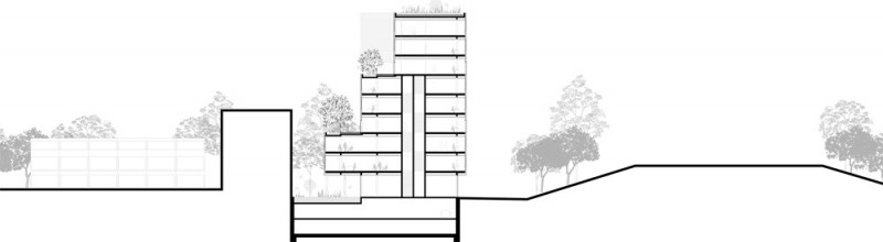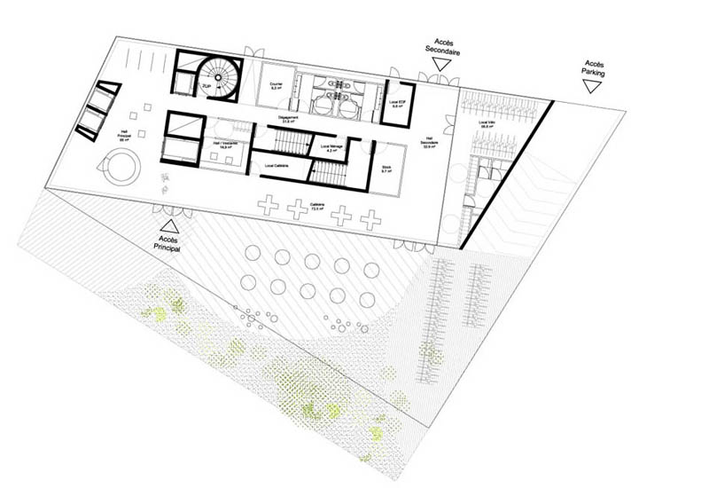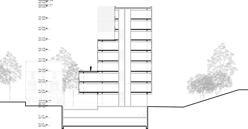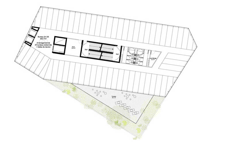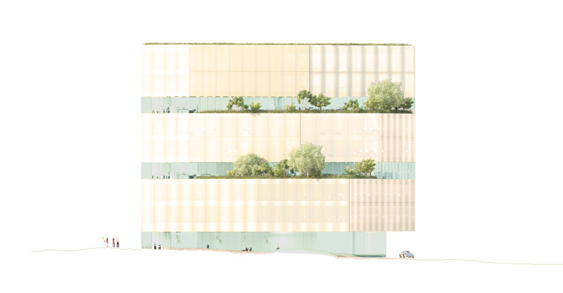 Notre architecture s’inscrit en continuité de la réalisation d’Henri Gaudin. Nous prolongeons le gabarit et la complexité formelle du siège Ipsos, que nous écrivons dans un registre contemporain. Le bâtiment s’ouvre en éventail pour s’affiner progressivement en gagnant en hauteur. Trois larges plans largement arborés sont ainsi libérés. Le premier au niveau du sol s’inscrit en continuité de l’espace d’accueil. Un vaste hall haut d’environ 5,50 mètres sous plafond se prolonge au sud sur la venelle. Puis 2 terrasses successives, l’une au 4ième niveau, l’autre au 7ième niveau ouverte au sud sur Gentilly en continuité des espaces de travail. La périphérie des espaces extérieurs est délimitée par des jardins suspendus. Chaque mouvement de la volumétrie met en scène une césure horizontale d’un étage, vitrée sur 1,95 m de haut.