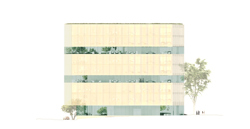 Le socle est l’interface du bâtiment avec l’espace public. Il abrite les espaces de représentation comme le hall et l’accueil, un centre de réunion, la cafétéria, ainsi que les espaces de services comme le local à vélos, l’aire de livraison et le local de gestion des déchets. Sous la partie ouest se trouve la rampe d’accès au stationnement. La sortie du parking débouche directement sur la rue, intégrée dans l’emprise du socle. Dissimulée par lesdégradés de verre sérigraphié, son impact visuel est minimum.