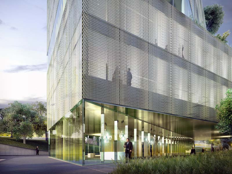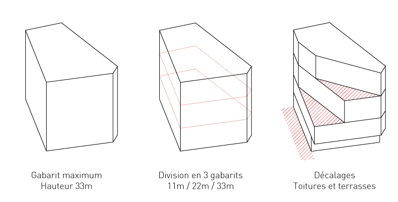Le bâtiment est composé de trois volumétries superposées ayant chacune ses caractéristiques propres. Résultant d’un travail sur les archétypes volumétriques de bâtiments tertiaires, la forme du projet affirme une géométrie simple, claire, géométrisée, face aux grandes étendues qui façonnent le paysage du périphérique parisien. Dans une recherche de rationalité, nous proposons une organisation autour d’une circulation centrale unique. Ce dispositif permet d’améliorer l’efficacité du plan type, en augmentant les surfaces utiles de bureaux tout en conservant un nombre limité de noyaux techniques, les déplacements internes s’en trouvant de facto réduits. Cette rationalité se reflète dans l’écriture des façades qui exprime strictement une trame de bureaux de 1,35 m. L’expression de la trame est sublimée par un travail sur une protection solaire extérieure progressive qui vient brouiller les pistes de lecture en créant un effet de moirage, conférant un aspect cinétique à l’ensemble. Ce motif se déroule de façon continue pour envelopper le bâtiment à la manière d’un papier peint tramé.