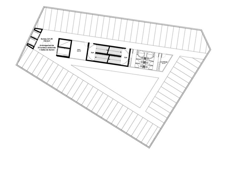 Les plateaux permettent tous une grande modularité ; ils ont été conçus en s’inscrivant dans les standards des typologies de bureaux. Chaque niveau est une variation sur des archétypes du 18 m pour les 2 premiers volumes et du 12 m pour le dernier. Cette compacité et cette rationalité nous permettent d’avoir un noyau extrêmement compact tout en présentant un escalier de type Chambord.