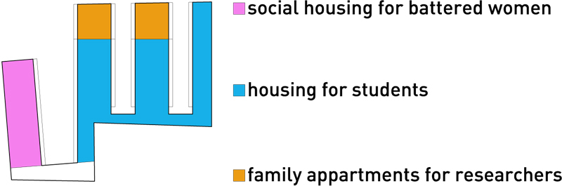 The conception of our project is from a second reading of the landscape, particularly the road of Saint Leu, by integrating its history and transformations to assert its manners and qualities and to reveal the poetry of the place. The project will act as a catalyst to create a future district by outlining a territory. This consists of complicated relationships between industrial and commercial buildings, historical flags, and public services. The objective is; to impose a politeness on the secondary road; to desynchronize the ‘shelf’ space – built by the rhythm of the automobile; to modify the perception of a landscape, which has undergone an uncontrolled territorial transformation. The project foresees the reception of three autonomous and additional programs: a residence for students of 150 housing for 170 residents, 19 housing for researchers or invited professors and housing for women in distress. The objective is to create social coeducation, where each establishment has its own human scale management system, resulting in a beneficial synergy between establishments. In conclusion the project foresees guard’s accommodation, private study rooms, laundry, space for relaxation, internal and external, and gardens with fruit trees. The project will break from a territory that is too dense for vegetation to grow and too chaotic to be urban. The project will reintroduce and prolong the morphology of the ‘fragment’, which has structured the district, by four buildings with different typologies. Where each allocated plots of land for a household and garden. This urban logic is controlled by a geographical logic, where buildings and facades are orientated east west, to protect against noise pollution. Their constructions fits within the size of the district, in volumes developed on more packed R+2. The volume of each of the 4 buildings is specific in order for them to become integrated into their immediate environments and to manage transitions with existing buildings. The global density of the plot of land will be about 1.25, a density that seems rather strong to suggest politeness and rather weak to be able to assert itself as a piece of the urban fabric. Within an ill-assorted district, the project will be an urban facade on the road of Saint Leu in the North; it will then rearticulate a landscape between the urban fragments of a dense south and suburban north.