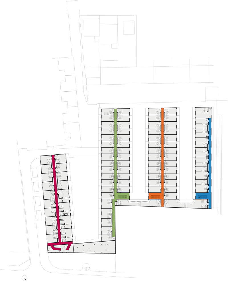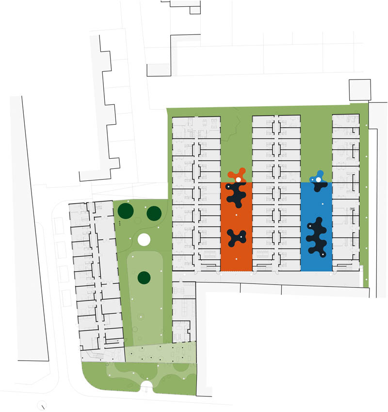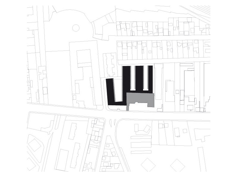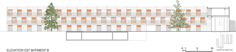 La conception de notre projet s’inscrit dans une relecture du paysage de la route de Saint-Leu. Elle intègre son histoire et ses mutations afin d’en affirmer les usages et les qualités, et révéler la poésie du lieu. Le projet devra jouer le rôle de révélateur d’un quartier en devenir, articulation d’un territoire fragmenté, synthèse d’un urbanisme composé de bâtiments industriels et commerciaux, de pavillons du siècle passé, de grands ensembles et d’équipements publics. Les enjeux sont d’imposer une urbanité à une route départementale, de désynchroniser le linéaire bâti du rythme de l’automobile, de modifier la perception d’un paysage ayant subi sans l’avoir contrôlé la mutation de son territoire. L’urbanité est là, mais bien peu lisible ; il s’agit d’en rendre la présence évidente. Le projet prévoit l’accueil sur la parcelle de trois programmes autonomes et complémentaires : une résidence pour étudiants de 150 logements pour 170 résidents, 19 logements pour chercheurs ou professeurs invités et des logements pour femmes en détresse. L’objectif est de créer de la mixité sociale tout en ayant pour chacun des établissements une gestion à échelle humaine bénéficiant de synergies entre les établissements. Ainsi le projet prévoit un logement de gardien, des salles d ’études, une buanderie, des espaces détentes intérieurs et extérieurs, des jardins aménagés avec des arbres fruitiers. En rupture avec un territoire qui serait trop dense pour être véritablement végétal et trop chaotique pour être urbain, le projet réintroduit et prolonge la morphologie du parcellaire qui structurait le quartier, par quatre bâtiments d’écritures différenciées. S’inscrivant dans la géométrie tout en longueur des parcelles du quartier, le bâti ménage de larges espaces de pleine terre végétalisée. A cette logique urbaine, se superpose une logique géographique avec une orientation rationnelle des bâtiments est-ouest et des façades protégées des nuisances sonores des voix ferrées et de la départementale par effet de masque. Les constructions s’inscrivent dans le gabarit du quartier, en volumes développés sur R+2 plus comble. La volumétrie de chacun des 4 bâtiments est spécifique afin de s’intégrer dans son environnement immédiat, de gérer des transitions avec les existants avoisinants. La densité globale de la parcelle sera d’environ 1.25, densité qui nous semble assez forte pour être porteuse d’urbanité et assez faible pour pouvoir assurer une couture avec la zone pavillonnaire mitoyenne. Élément fédérateur d’un quartier disparate, le projet sera façade urbaine sur la route de Saint-Leu au nord, pour devenir plus paysagé et se lover dans la continuité d’un parcellaire pavillonnaire très structuré au sud.