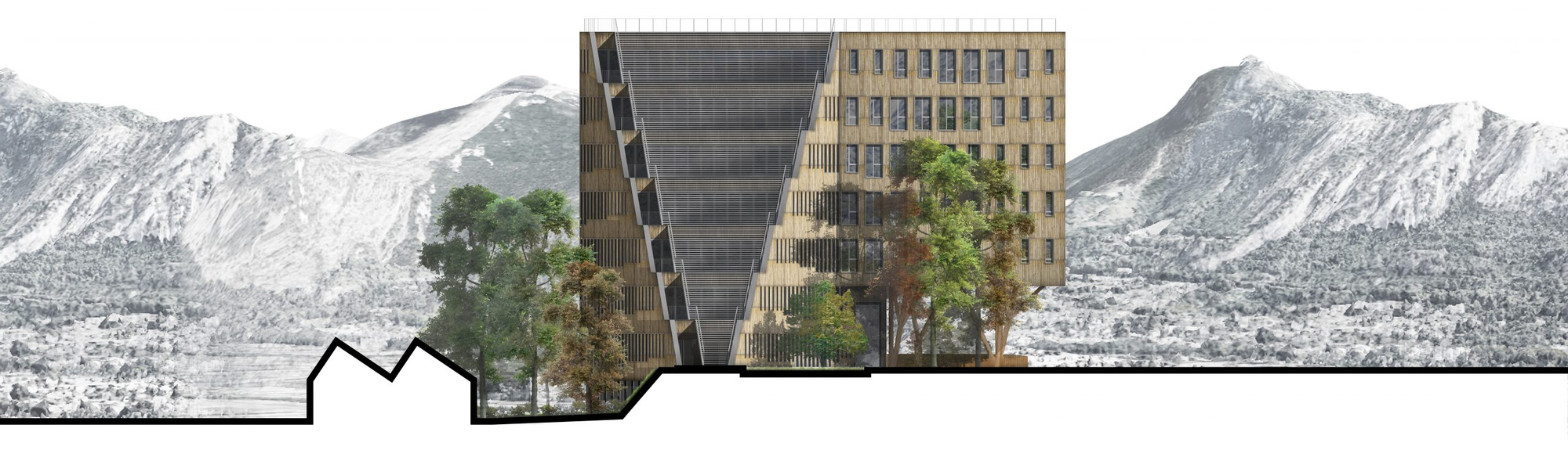 Équipe : Iliade (Économie et Fluides) / Matté (Structure BA) / Arborescence (Structure bois) / Arcora (Façades) / Topager (Espaces verts) / Latitude (Écologue) / C+Pos (AMO Environnemental)