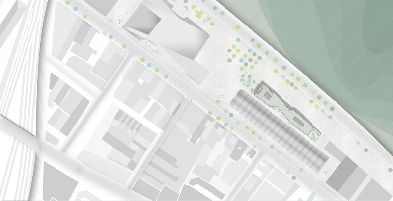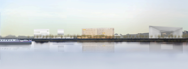 C’est un environnement organisé par le lit du fleuve, un paysage singulier des rives de la Garonne de Bordeaux. Nous sommes en présence d’un site tout en longueur, souligné par les halles rectilignes et le jeu des voiries. La parcelle s’inscrit dans cette géométrie accompagnant une linéarité liée intimement à la géographie. Ici tout est déplacement : l’eau, le flux des voitures, une promenade rectiligne qu’il convient d’accompagner sans la cadrer de façon excessive, sans figer un paysage dynamique caractérisé par la fluidité et le mouvement. Ici on voit loin, ici on est vue de loin, c’est donc un projet de paysage que vous nous proposons, un projet qui est vu tout en sachant être discret, un projet ouvert sur le grand Bordeaux, le fleuve, et son environnement.