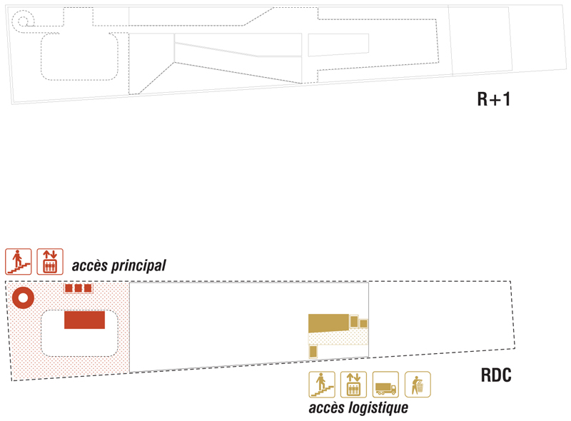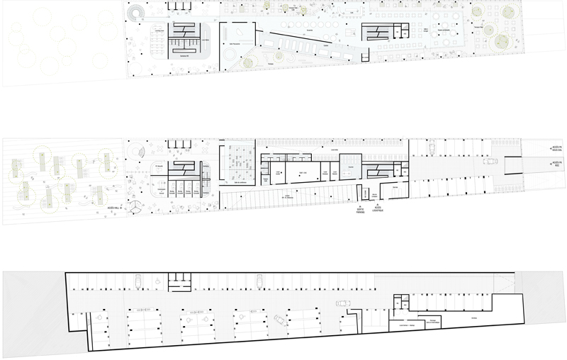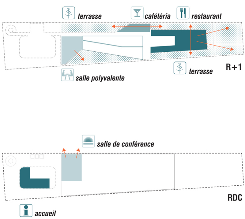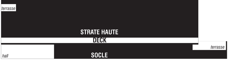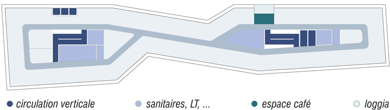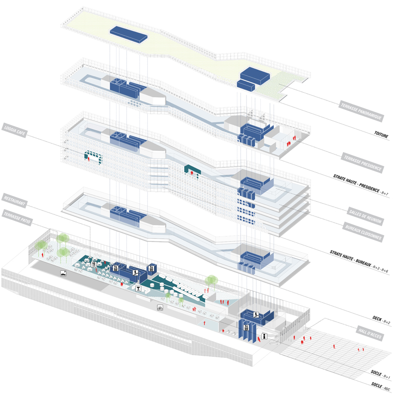 Les programmes partagés et à destination d’un public plus large que celui du personnel des bureaux sont regroupés dans les niveaux Rez-de-Chaussée et R+1 qui composent le Socle du bâtiment. Le Deck (R+2) constitue un niveau de césure qui met en valeur la Strate Haute (R+3-R+7) du bâtiment contenant la majorité des espaces de bureaux.